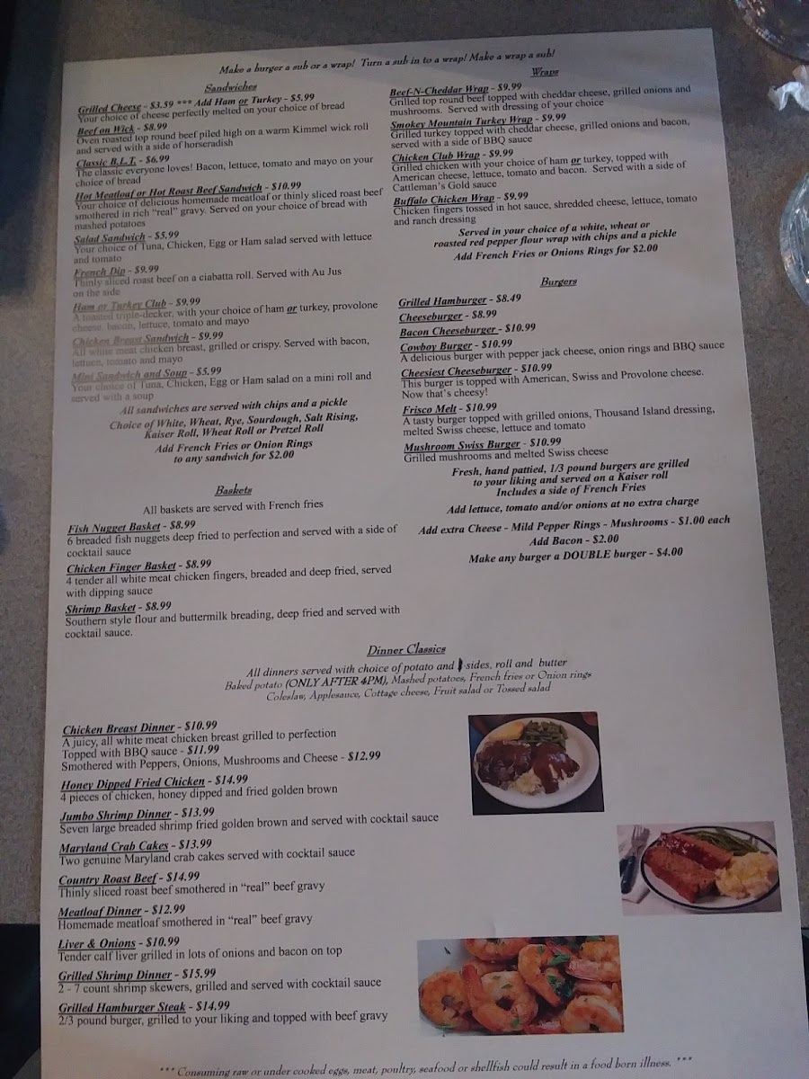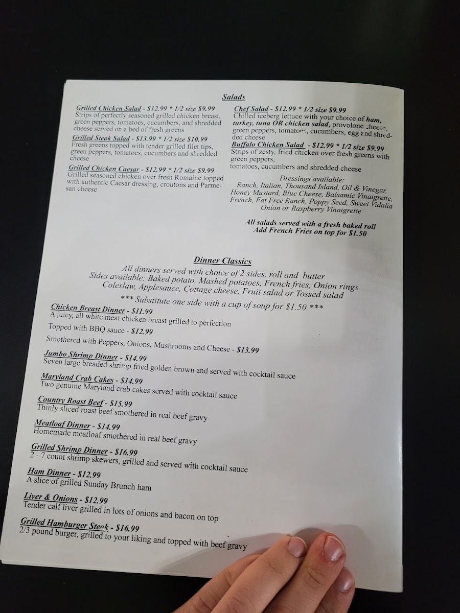 Morning visitors often enjoy generous breakfast combos, such as omelets and traditional favorites, paired with warm coffee or hot tea. Later in the day, the menu shifts to include dinner classics like roast beef, shrimp, and meatloaf, all served in a welcoming setting that feels unpretentious and homey.